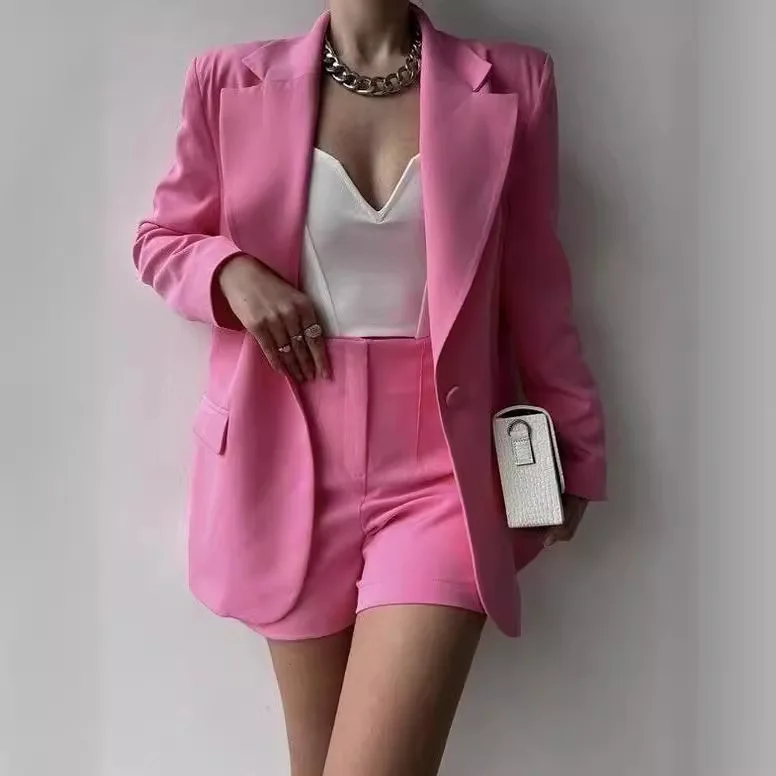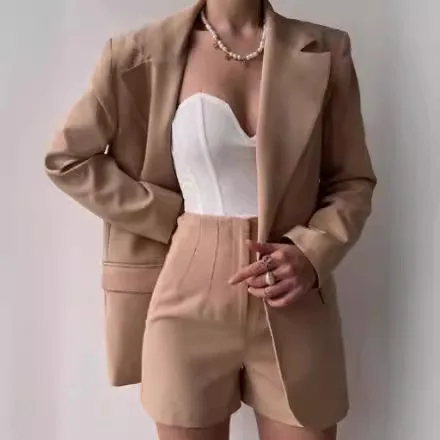 2025 Spring Autumn Fashion Notched Collar Blazer Top & Slim Bodycon Shorts Outfit Commute Elegant Solid Two Piece Women Suit Set